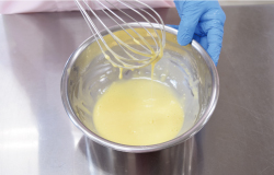 〇バッター液はボウルに小麦粉を入れ、泡立て器などで軽く混ぜてダマをなくし、卵、水を加えてよく混ぜます。