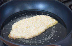 〇表裏、まんべんなくパン粉をつけます。肉に厚みがあり、側面のパン粉の付きが良くない場合は、横からも押さえてパン粉をつけます。