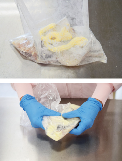 〇袋に小麦粉と魚を入れて軽く振り、小麦粉を薄くまぶします。