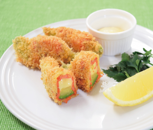 ②アボカドは縦半分にしたものを6等分のくし切りにします。ベビーチーズは縦3等分にします。