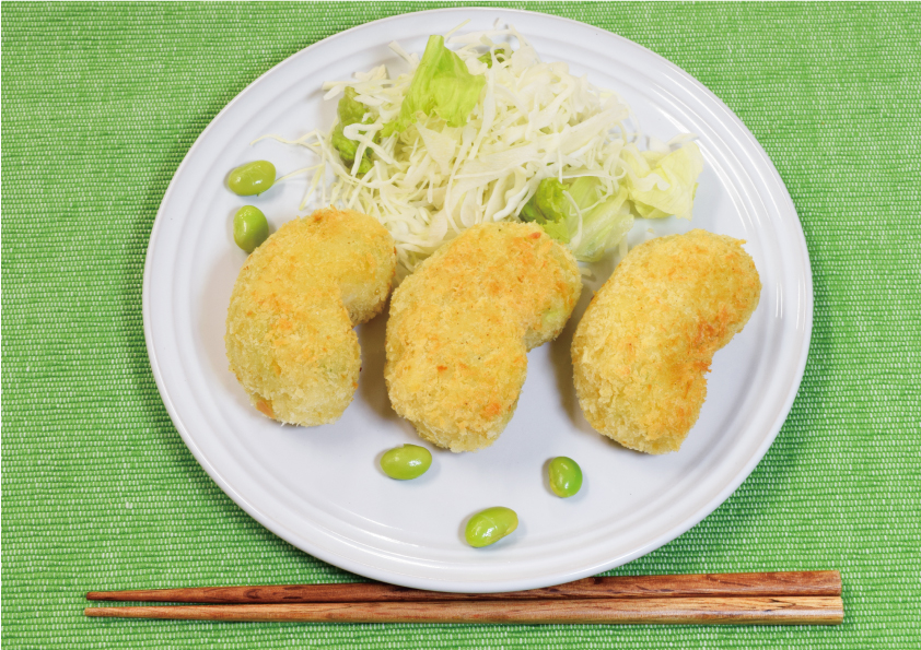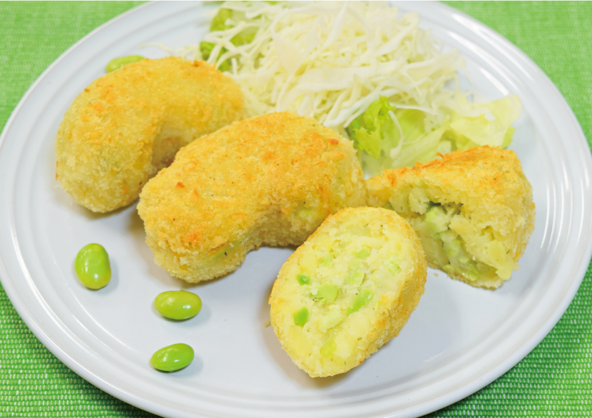 ③じゃがいもに砕いた枝豆、コンソメ、塩を加えて混ぜ合わせ、3等分にしてお好みの形にまとめます。