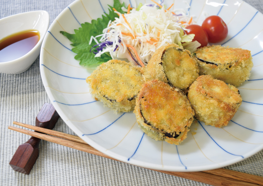 ⑤なすを④にくぐらせ、バットに入れたパン粉をまぶします。ツナが出てこないように横側にもつけましょう。