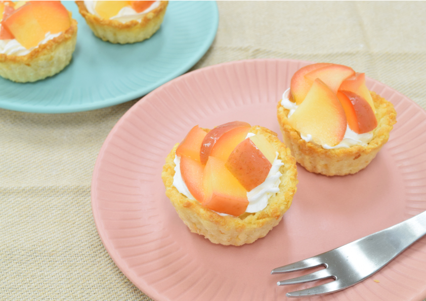 ⑥タルト生地が冷めたらホイップクリームをしぼり、煮りんごをのせて完成です。