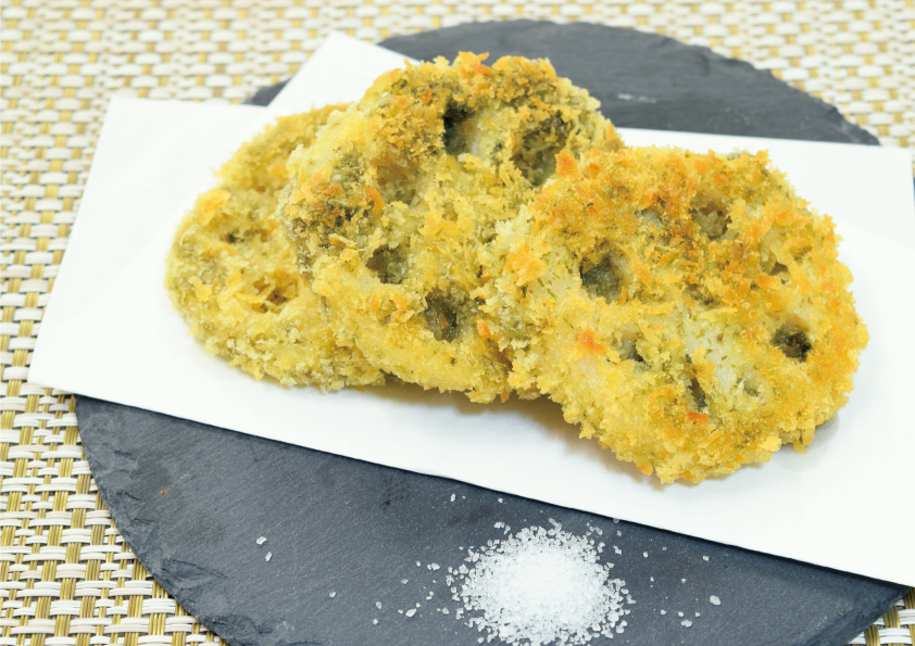 衣のカリカリとレンコンのシャキシャキで楽しい食感。お塩をつけてお召し上がりください。