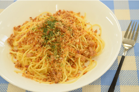 ①フライパンにオリーブオイルを入れ、ツナ缶とパン粉、山わさびドレッシングを入れて弱火でじっくり炒めます。